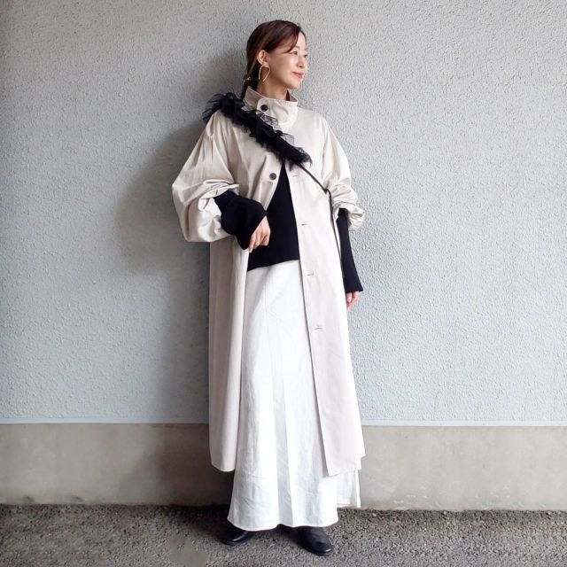 こちらは、アイボリーのコート&スカートを合わせたコーデのアクセントに黒を使用。ベーシックな色合わせですが、黒の引き締めカラーを効果的に使うことで、アウターとボトムスが同じ色でもメリハリをプラスできるんです。