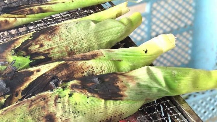 師匠のつくるしろみつとろきび自体が甘くておいしいのはもちろんなのですが、皮付きのトウモロコシを炭火でじっくりと焼くと甘みがぎゅっとつまって濃厚に…。