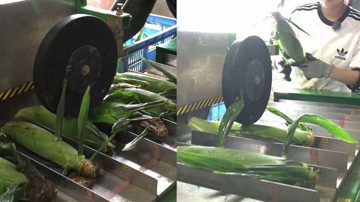 「もろこさん」という専用の機械にトウモロコシをのせて余分な茎を切断していきます。