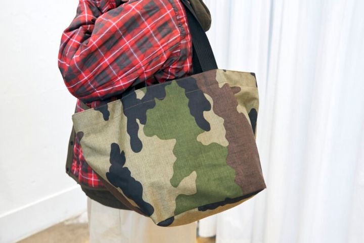 「帰省のとき、着替えはカート付きのスーツケースに入れますが、他の荷物はこのバッグに入れます」と森さん。ユニセックスなカモフラージュ柄が、大人カジュアルにぴったり。