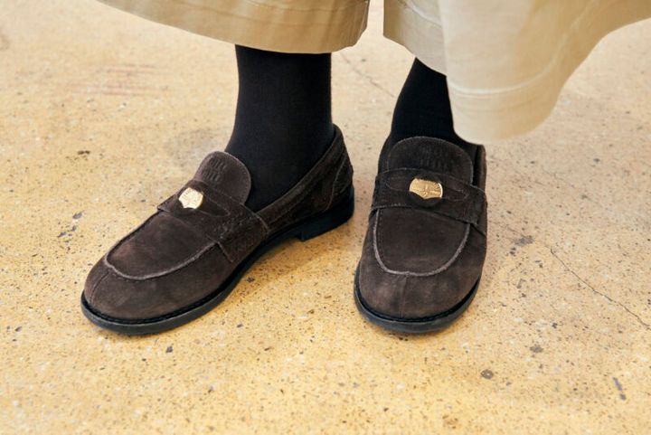 ワイドチノパンでリラックスする分、足元は濃色で引き締めます。「歩きやすくて暖かいスウェードのローファーは秋冬に大活躍します」と森さん。パンツの丈感と靴との抜け感のあるバランスも絶妙です。