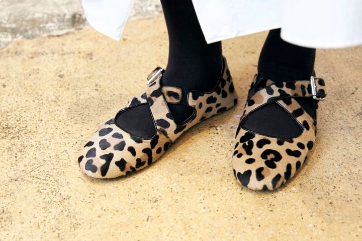 シンプルな白コーデに、アライアのレオパードのバレエシューズを合わせると、たちまちモダンな印象になります。「ヘアカーフもレオパードも大好きです」と森さん。