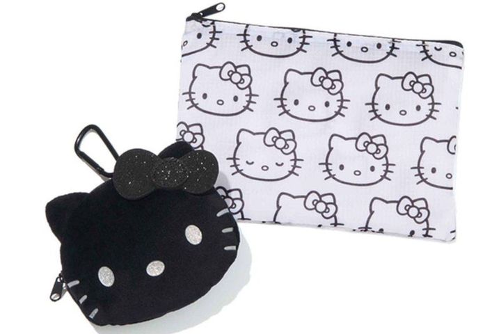 黒×サテン調の生地が使われたキティちゃんの巾着ポーチは、いつもの雰囲気よりもぐっとエレガント。