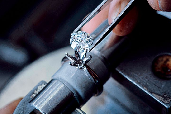 自社で、石をリングの台座にセッティングするダイヤモンドセッターの手元。