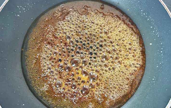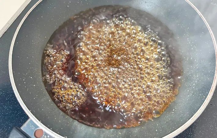 焦げつかないように時々フライパンを回しながら、カラメル色になるまで加熱してください。