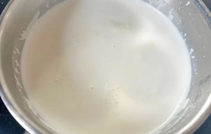 鍋に牛乳と生クリームを入れて温めましょう。この時、加熱しすぎると膜が張ってしまうので、沸騰直前で火を止めるのがポイントです。