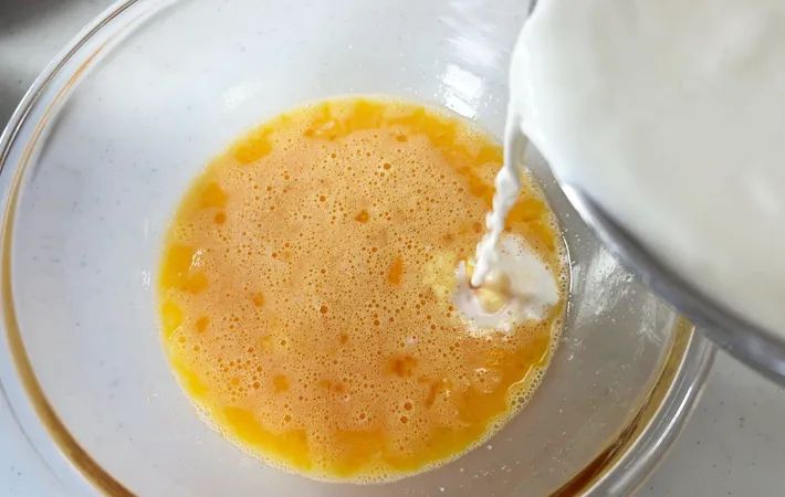 温まった牛乳と生クリームを卵液に流し入れましょう。一気に流し入れず、10回くらいに分けて少しずつ加えてください。