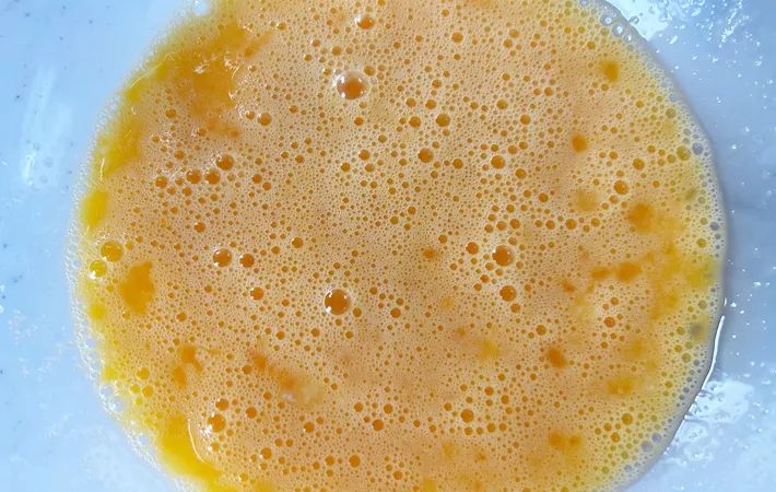 卵をボウルに割り入れ、砂糖を加えてよく溶きます。後に牛乳と生クリームも加えるので、大きめのボウルで作業してください。