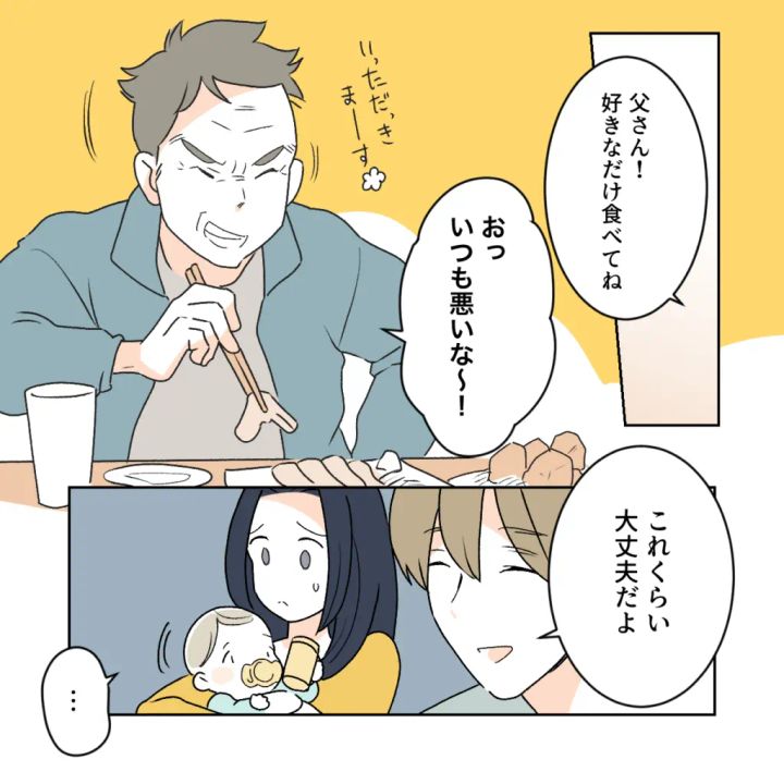 お七夜以来、「ユウスケに会いたいからご飯に行こう」と義父から頻繁に誘われるようになったショウタさんとマミさん。ショウタさんは嬉しそうですが、ビールを飲み、好きなものを食べ、支払いは毎回ショウタさん任せにする義父を、マミさんはどうしても信用できずにいました。本当はユウスケくんに会いたいのではなく、ただ食事目当てでショウタさんに連絡しているだけなのでは・・・義父に都合よく使われていることに気付かないショウタさんに、マミさんの苛立ちは次第に募っていきました。実の子に当たり前のように食事をご馳走になる父親・・・情けなくて見ていられません。