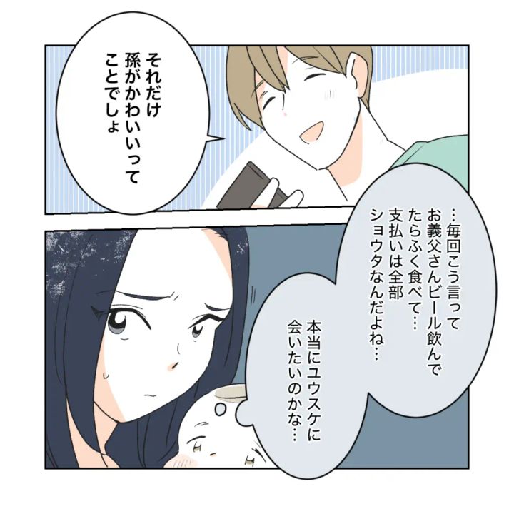 私が「また?この間行ったばっかりだよ?」と言うも、ショウタは笑顔で「それだけ孫がかわいいってことでしょ」と疑うことを知らない様子。義父はいつも同じ調子で私たちを食事に誘いますが、ビールを飲んで好きなものを食べて、支払いは毎回ショウタ任せ。本当にユウスケに会いたいと思っているのか・・・それすらも疑ってしまいます。