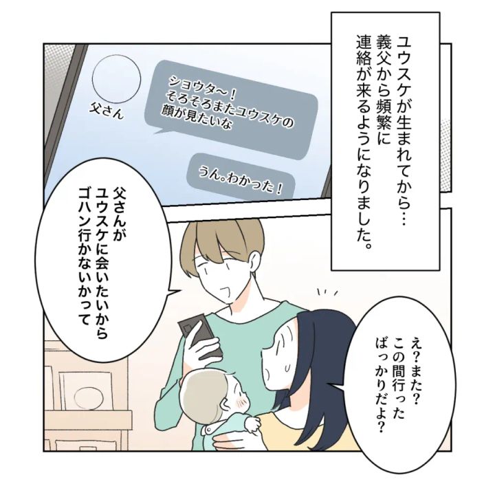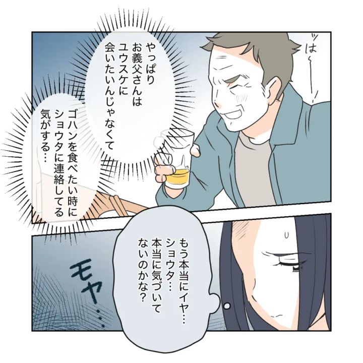 それからというもの、義父から頻繁に連絡が来るようになりました。「父さんがユウスケに会いたいからご飯行かないかって」ショウタは嬉しそうに言いますが、私はどうしても義父を疑ってしまいます。