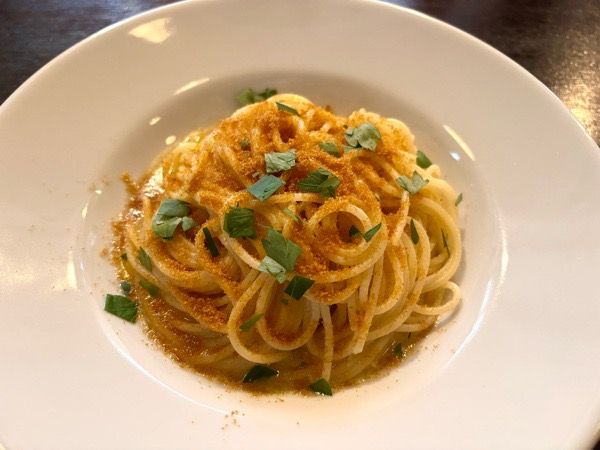 本日のパスタは「ボロネーゼ」と「ボッタルガ」です。「ボッタルガ」はイタリア産からすみです。からすみの香りが広がり五感を刺激します。サルバーニョのオリーブオイルがからまった麺はアルデンテでちょうど良い食感です。焼きたてのバゲットがすすみます。