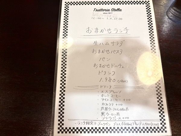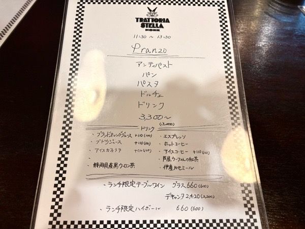 ランチは3300円と1980円の2種類です。今回はパスタやドルチェが選べる3300円のコースをオーダーしました。