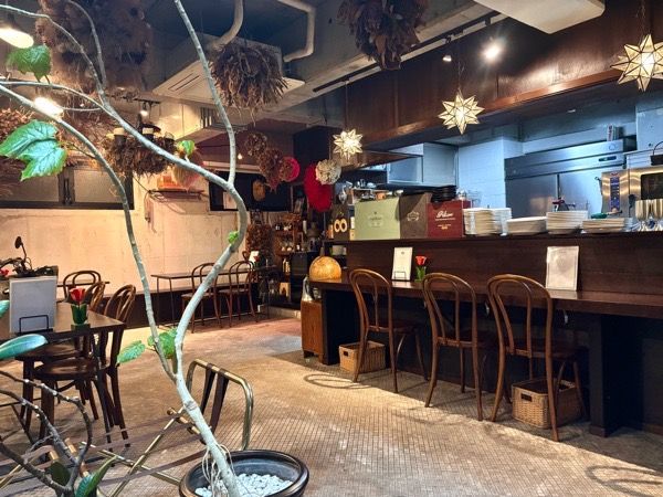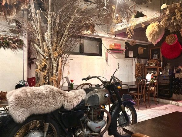 扉を開けるとまず見えるのが整頓されたオープンキッチン。その前のカウンターは6席、奥にはテーブル席が3つあります。通路が広いのでゆったりとしています。天井からつるされたドライフラワーや存在感のあるシンボルツリー、そして往年のファン必見のメグロのバイク。ハイセンスなビンテージ空間も「TRATTORIA STELLA(トラットリアステラ)」の魅力の一つです。