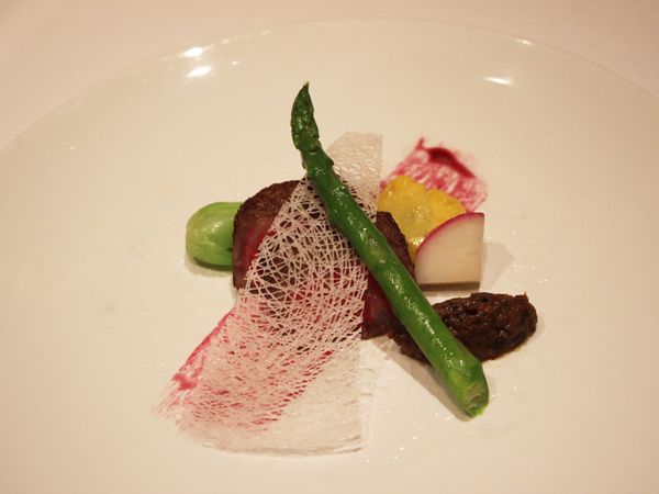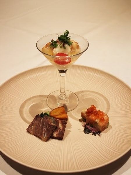 八角やシナモンといったスパイスが香る牛ほほ肉、カリフラワーとイセエビのムース風、塩麹とゴマ油で味付けしたサーモンと山芋のタルタルが1プレートに。