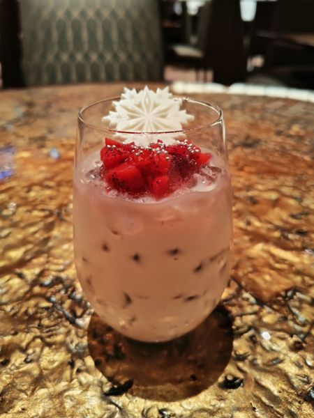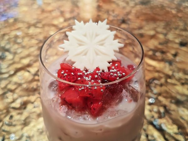 ライチミルクティーをベースに、コーヒーやチョコレートシロップ、バニラシロップなどで、クリスマスの妖精“リルリンリン”を表現。優しい甘さと、コーヒーのビターな味わいが特徴のドリンクです。アラザンで作られた雪の結晶もアクセントに。混ぜて飲むとストロベリーのほのかな酸味も味わえます。