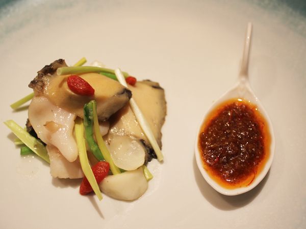 アワビとツブ貝を塩味で炒め、さっぱりとした味わいに。少しピリ辛のオリジナルの花椒醤で味変しながら食べるのもオススメです。