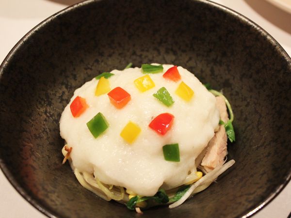 「チャーシューと葱の和えそば 蕪の淡雪仕立て」は、細切りの叉焼と葱に、豆苗、豆もやしを和え、貝柱ベースで仕立てた和えそば。淡雪風にした蕪のペーストにはクリスマスをイメージして、黄・赤・緑のパプリカがちりばめられています。