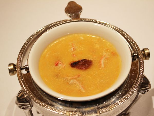 「雲丹と蟹肉のスープ」はウニとカニ肉のうま味が詰まったまろやかな味。しょうゆで焼いたウニが上に乗っています。