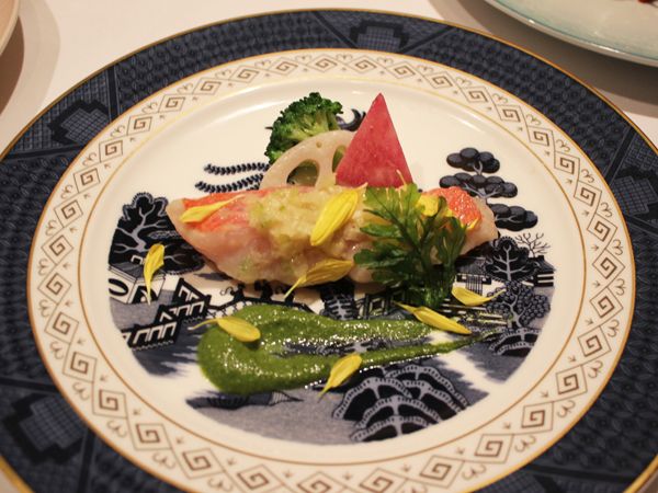 ネギショウガをのせて蒸した金目鯛を、春菊・腐乳(中国の伝統的な発酵食品)、カシューナッツを合わせたソースで味わう「金目鯛のスチーム 春菊ソース。