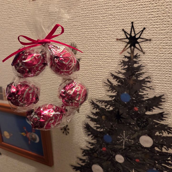 オーナメント風のラッピングの出来上がり!✨可愛い!!!クリアバックの大きさは、お菓子のサイズにもよるんですが、大きい方がやりやすいと思います!この画像のやつはちょっと小さめかもです!チロルチョコとかの大きさならいけるかも🤔あとは、何個かお菓子などをクリアバックに入れて口の部分にそのサイズに切ったクラフト紙をホチキスでかちゃん