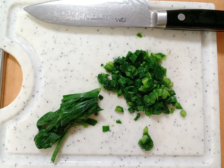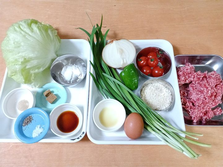 1. レタスはさっと茹でる。玉ねぎはみじん切りにし、フライパンを熱してサラダ油を引き、炒める。ニラはさっと茹でてみじん切りにする。