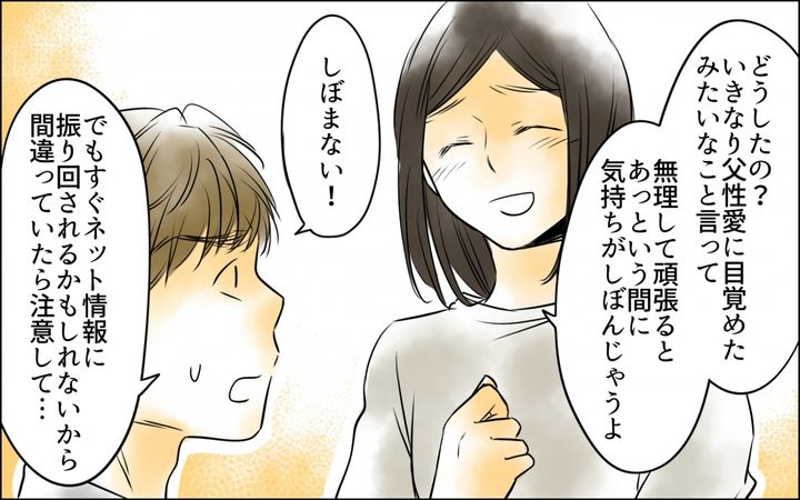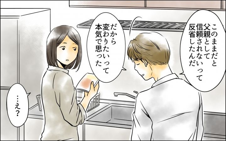 娘の偏食を理解できず「好き嫌いは母親の責任」と妻を責め続けていた夫。しかし、ようやく自分の間違いに気づき、妻に謝罪。妻は保育園から「成長しているから大丈夫」と言ってもらえたと安堵の涙をこぼし、孤独な子育ての辛さを吐露して、これからは夫婦で向き合っていこうと前を向くのだった。