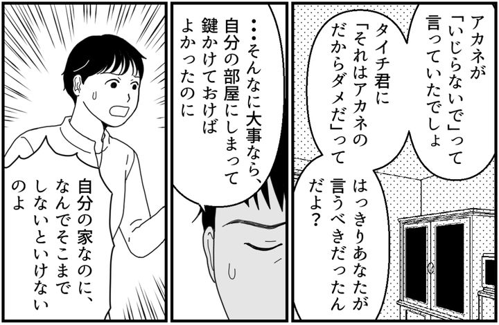 アカネの気持ちを思うと、私だって怒りがおさまりません。そもそも今回のことは、夫がタイチ君を止めていれば起きませんでした。アカネは出かける前に「いじらないで」と言い残していたし、夫もちゃんとそれに返事をしていたのです。
