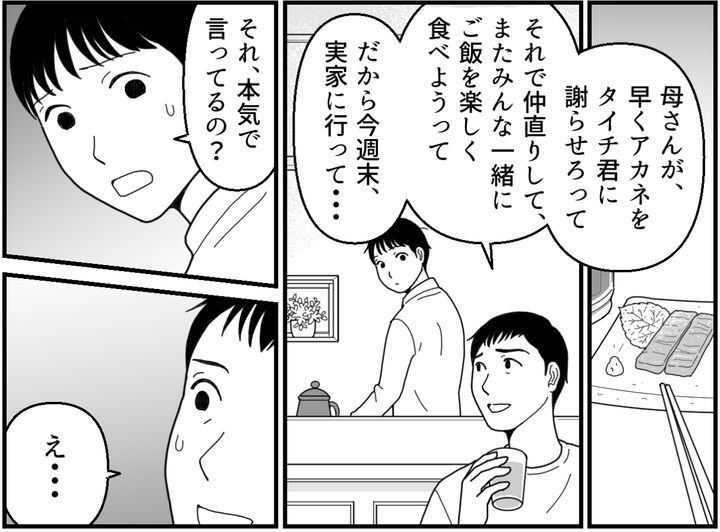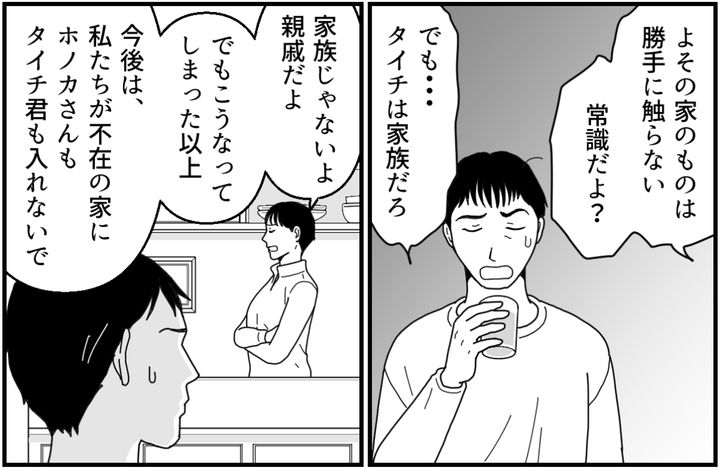 タイチ君は家族じゃなくて親戚です。それにもしタイチ君がよその家で同じことをやったら、大問題になるでしょう。なぜ相手がアカネなら許されるのか……。ひたすら責任逃れするような夫の発言にも腹が立ちます。