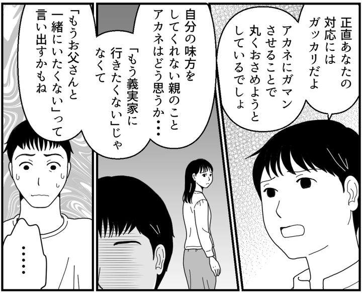けれど義母もホノカさんも、夫すらも、そんなことで怒るアカネの方が悪いというような態度。今後もアカネをガマンさせつづけるのなら、そんな関係はいらないです。アカネの味方になってくれない夫もいらないです。