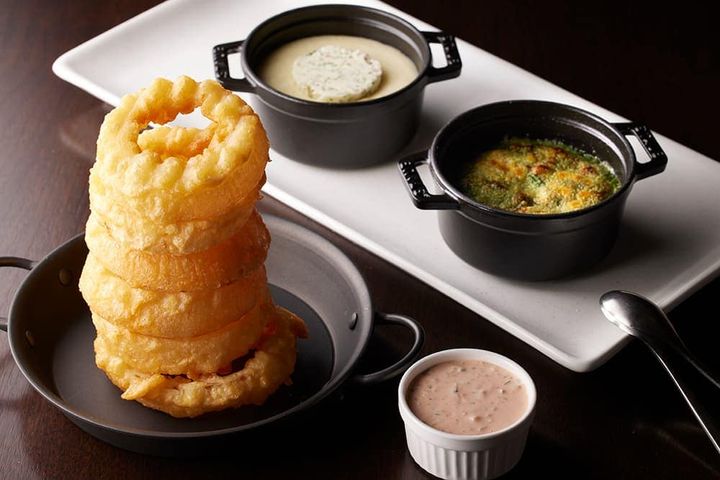 オニオンリングや野菜のピュレなど、定番のサイドディッシュも合わせて楽しめます。
