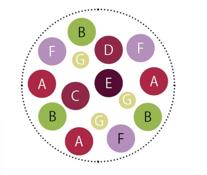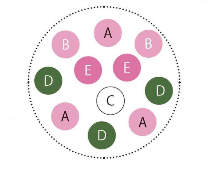 多彩な植物があってもまとまりがあるのは、赤紫と薄い黄緑の2系統に色を絞っているから。また、同系色同士は違う形が隣り合うように配置することで、調和と変化のバランスが保てます。植物の生育がゆるやかな冬だからこそ楽しめる寄せ植えです。