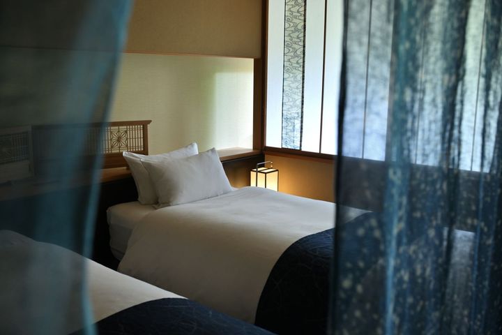 客室は栃木の民藝「黒羽藍染」でしつらえたご当地部屋。魔除けや厄除けの色とされる藍色の空間が参拝への気持ちを高めてくれますよ。