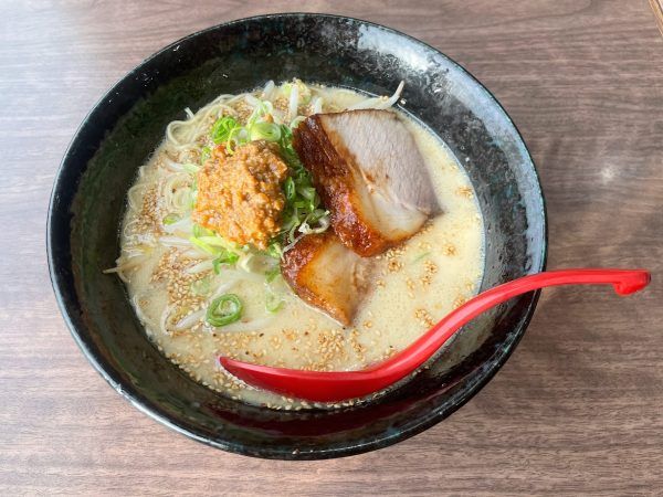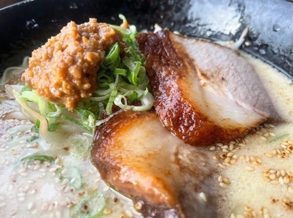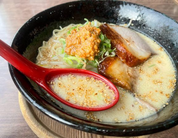 白胡麻たっぷりのこちらのとんこつスープ、濃厚ながらもあっさり感もあって美味しい! とんこつのまろやかさは細麺とのバランスもよく、女性でもスルスル食べやすいラーメンでした!
