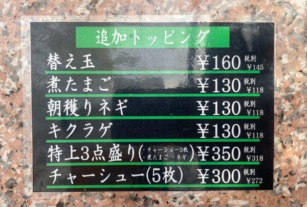 トッピングも種類豊富です。店内仕込みの「煮たまご」、「朝獲りネギ」、チャーシューが3枚ついた「特上3点盛り」など! どれにするか迷いますね~。
