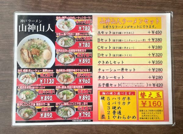 写真を見るだけでも食欲がそそられる~! ベースはとんこつで、仙台と神戸のコラボレーション「あっさりスープラーメン」や、ガツンと強気にニンニクたっぷり「元気盛りラーメン」など多種類から選べます。 お得な「餃子+焼きめしセット」や「チャーシュー丼セット」も気になりますね~。 麺の硬さは5種類からチョイス。替玉は¥160です。