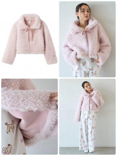 まるでプードルのようなくるんとした柔らかなボア素材を使用。襟元のリボンでラフに前を留められるデザインです。