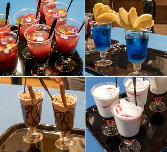 席に着く前に4種類用意されたドリンクの中から1つを選びます。すべて物語をイメージして作られたもの。写真左上から時計回りに、フェルッチョとビアンカをイメージした、唯一アルコールの入った「アサイーとカシスのソーダ」、ヘルメスとセバスチャンをイメージした「きんもくせい香るゼリーソーダ」、サロモーネ兄弟をイメージした「オレンジスパイシーチョコレート」、ガルシア一派をイメージした「ココナッツストロベリーラッシー」。特に一番人気の「きんもくせい香るゼリーソーダ」は口の中が青くなるのでご注意を。