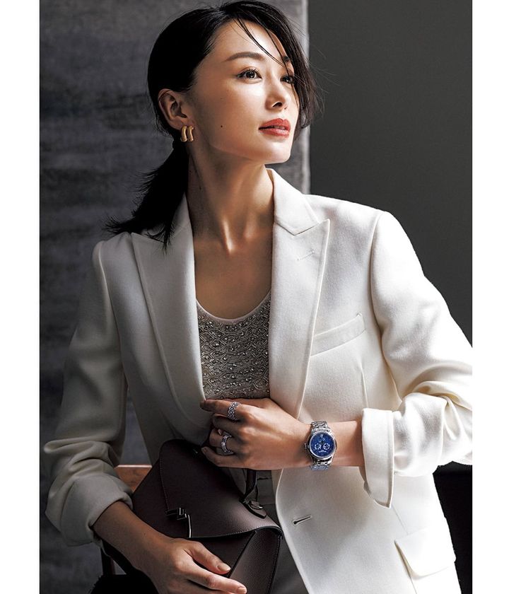 時計「4947/1A」〈SS、38㎜、自動巻き、SSブレスレット〉¥8,300,000(パテック フィリップ/パテック フィリップ ジャパン・インフォメーションセンター)左手人差し指のリング¥1,320,000左手薬指のリング¥792,000ピアス¥792,000(すべてブチェラッティ)ジャケット¥341,000(マディソンブルー)中に着たオールインワン¥163,900(エリザベッタ フランキ/エリザベッタ フランキ/エスケーシー)バッグ¥625,900(モワナ/モワナ 伊勢丹新宿店)