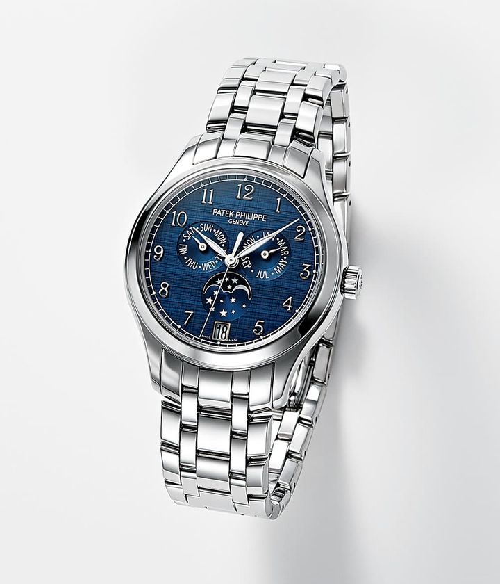 シルクのような質感のブルー文字盤が意志の強さと共に女性らしさもアピール。立体感のある38㎜のラウンドケースはスーツの袖口とのバランスもとりやすく、新しい女性リーダー像の象徴に。時計製造のすべての工程を自社で一貫して手がける世界でも数少ない「マニュファクチュール」の最高峰。1996年にパテックが世界で初めて開発したアニュアルカレンダーは月、日付、曜日を表示し、年に一度手動で日付を調整するだけで正確な日時を表示し続けてくれます。