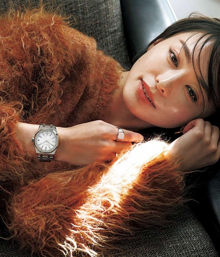 時計「ロイヤル オーク オートマティック」〈SS、41㎜、自動巻き、SSブレスレット〉¥4,125,000(オーデマ ピゲ/オーデマ ピゲ ジャパン)右手人差し指につけたリング¥48,900ピアス¥57,500(ともにトムウッド/トムウッド 青山店)カーディガン¥75,900中に着たニット¥49,500(ともにアンスクリア/アマン)