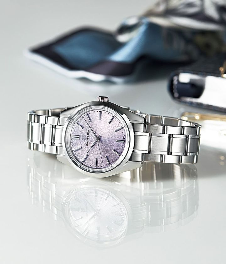 淡いパープルの上品な顔立ちの文字盤は製造地の岩手県の県花「桐」から着想されたカラー。36.5㎜径のミドルケースは、日本女性の華奢な手首に程よくフィットするサイズ感です。
