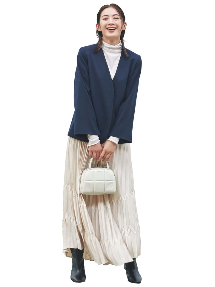 ジャケット¥75,900スカート¥47,300(ともにエブール/リトルリーグ インク)タートルネックトップス¥20,900(ANAYI)バッグ¥159,500(ロンシャン/ロンシャン・ジャパン)パンプス¥22,000(オデット エ オディール/オデット エ オディール 新宿店)イヤリング¥8,640(アビステ)ネックレス¥286,000(ウノアエレ/ウノアエレ ジャパン)時計¥64,900(ディーワン ミラノ/エイチエムエスウォッチストア 表参道)