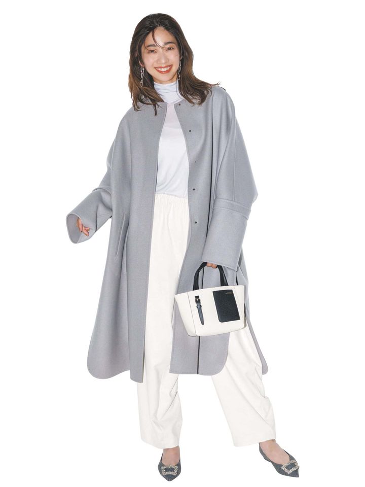 黒に走りがちな冬に投入したい、ニュートラルカラーのロングコート。フレッシュなカラーのコートを羽織れば、高揚感も高まること間違いなし!