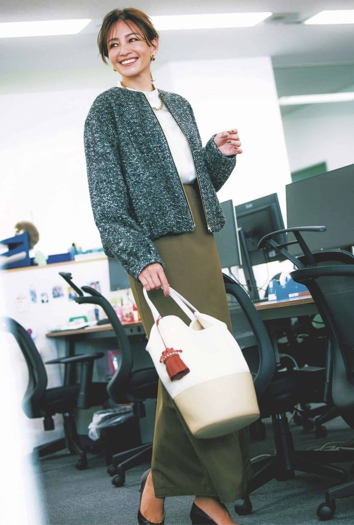 ツイードブルゾン¥49,400(23区/オンワード樫山)ブラウス¥31,900(サクラ/インターリブ)スカート¥24,970(イウエン マトフ/ユナイテッドアローズ 渋谷スクランブルスクエア店)バッグ¥165,000チャーム¥42,900(ともにJ&M デヴィッドソン/J&M デヴィッドソン カスタマセンター)パンプス¥19,800(オデット エ オディール/オデット エ オディール 新宿店)ピアス¥20,900ネックレス¥45,100(ともにローラロンバルディ/八木通商)