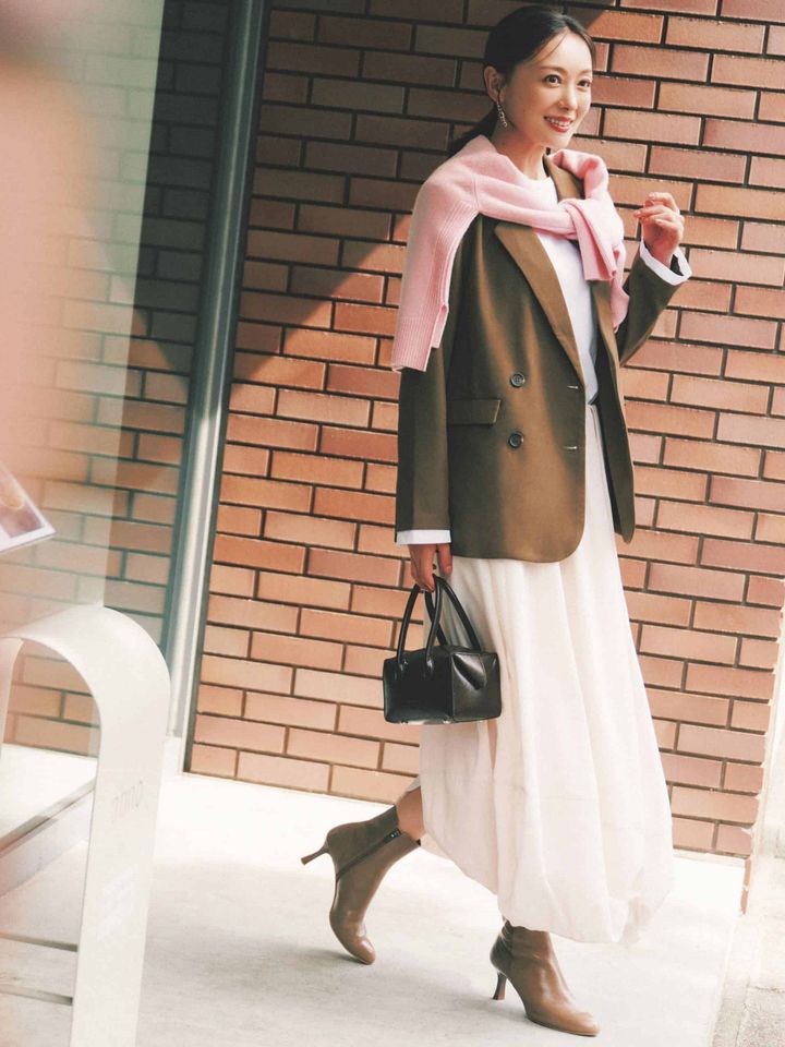 甘めスカートを利かせたた白コーデも、ジャケットを羽織ればたちまいちオフィス仕様に。こっくりカラーをチョイスすると堅くなりすぎず、洒落感が生まれます。小物でピンクを取り入れれば、朝の通勤もテンションが上がりそう!