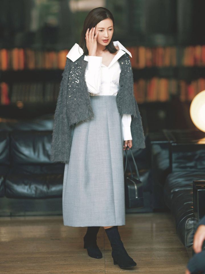 シャツをベースにした、上品なグレーのワントーンコーデ。華やぎ不足が気になったら、ビジュー付きカーデなど煌めきのアクセントを入れてみて。