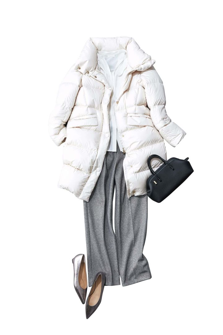コート感覚で着こなせるスタンドカラーのロングダウンは、真冬の通勤の頼れる存在。カラーは、重くならず上品さもピカイチの白がおすすめ!重くなりがちな冬コーデに抜け感を出してくれます。
