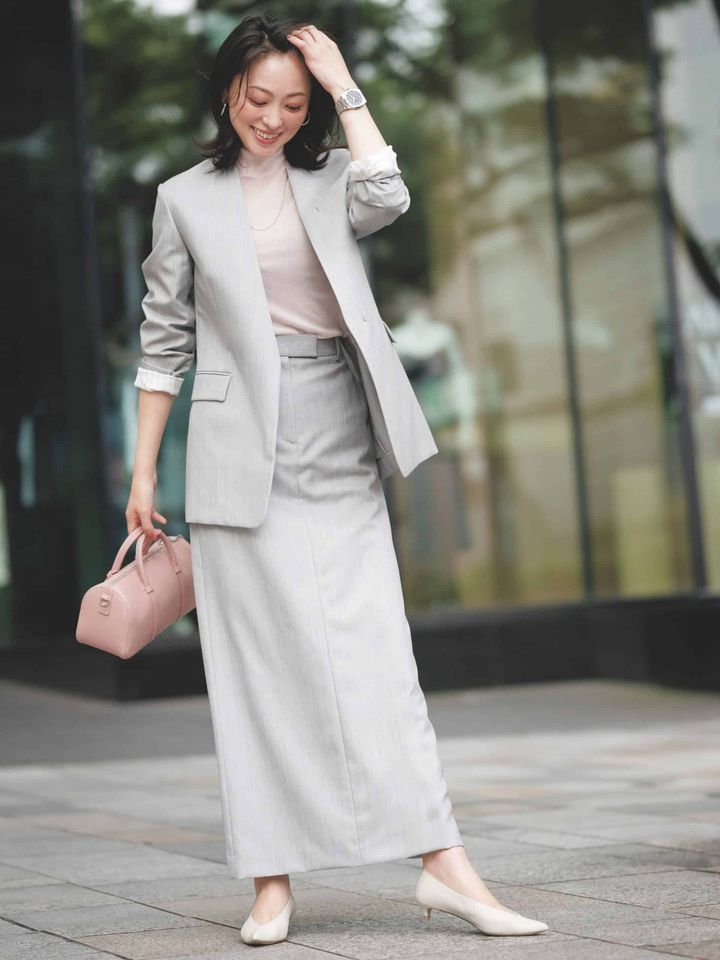 シックさと華やぎを両立してくれる、薄いグレーのセットアップ。シャープなタイトスカートとの組み合わせで知的な印象に仕上がります。ピンクを差し色に取り入れて女らしさをアピールしたい。