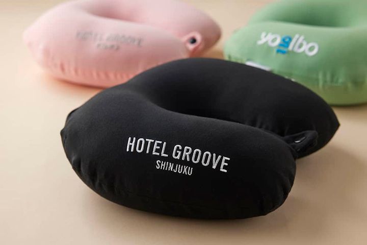 また、コラボレーションを記念した限定アイテムも登場。〝HOTEL GROOVE SHINJUKU〟×〝Yogibo〟のダブルネームネックピローを限定販売(¥6,600)。旅のお供や想い出にもおススメです。